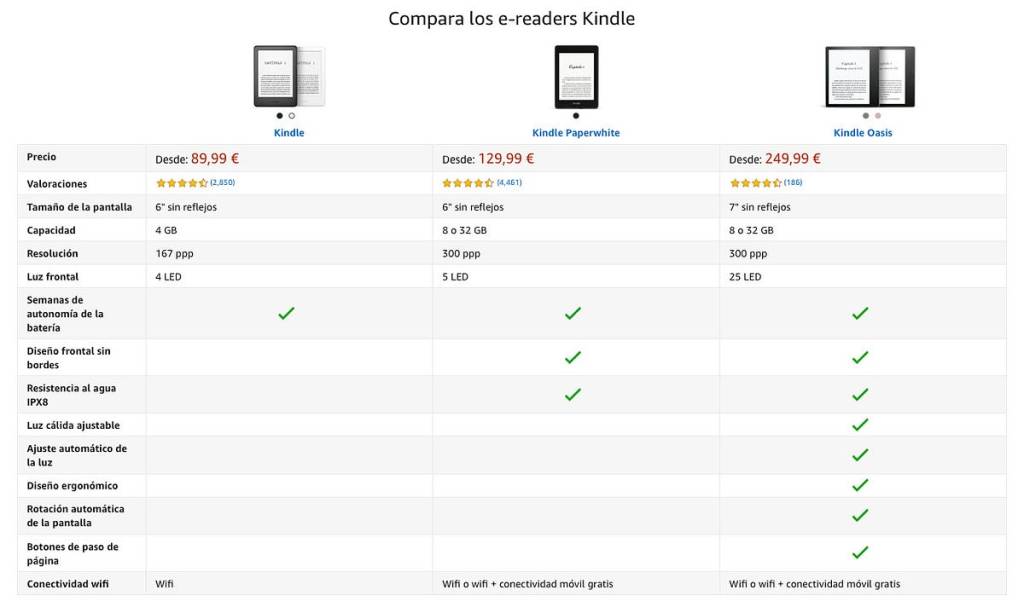 Ahora quedaba elegir el dispositivo. Por un lado descarté el Kindle Oasis ya que su versión de acceso son 250€ y estaba por encima de mi presupuesto. El que me decantase por la versión Paperwhite vino motivada por la mayor resolución de su pantalla, 300 ppp frente a 167 ppp, y por el espacio de almacenamiento, el Kindle a secas tiene 4 GB que en la práctica son 2,7 GB y el Paperwhite 8 GB que útiles son 5,8 GB. Además el Paperwhite tiene mejor iluminación, es resistente al agua y la pantalla es más blanca.