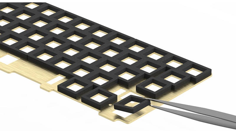 - Módulos de foam: este foam adhesivo en forma de cuadrados huecos se pega a la plate por la parte inferior, de manera que queda como un sanwich: la plate, el foam adherido y la PCB. Este foam será el encargado de absorver prácticamente todas las vibraciones que se produzcan al accionar los switches. (En Keygem)