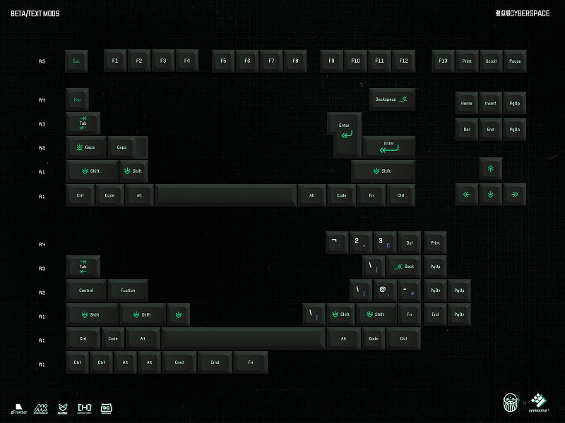Desde el primer momento que vi el set de KAT Cyberspace en el post de la GB de Geekhack tuve muy claro que iba a ir de cabeza a por él. Es un teclado inspirado en la temática cyberpunk que tanto me gusta. Se basa en filmografía de culto para la simbología, tipografía y colores: Matrix y Ghost in the Shell han sido referencias para su autor.