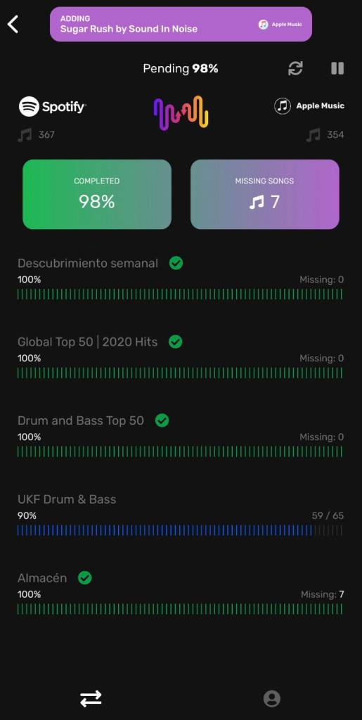La verdad es que funciona bastante bien y todo lo que quería ha sido exportado, he dejado tan solo algunas listas como la de descubrimiento semanal para hacer exportaciones de forma puntual. Como puede verse en las capturas la aplicación de iOS es bastante simple y una vez hemos seleccionado destino, origen, concedido el acceso e indicadas las listas a exportar se muestra así: distintas barras de progreso para cada lista, las canciones de origen, las que ha logrado trasladar y las que han dado error por no encontrar equivalente en el destino.