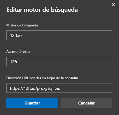 Hay otra manera sencilla de tenerlo integrado en el navegador y es añadiendo un buscador personalizado o un atajo de búsqueda, dependiendo del navegador se llama de una forma u otra. Esto hace que, en mi caso, si pongo en la barra de dirección 12ft, pulso tabulador, pongo la URL a la que quiero ir y pulso enter, automáticamente cargará la web a través de este servicio.