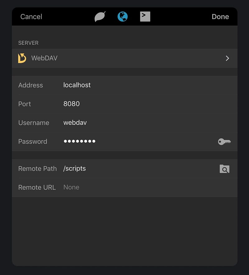 La otra opción interesante es la posibilidad de conectarse con Coda, o con cualquier IDE que soporte servidores WebDAV. Working Copy tiene integrado un servidor WebDAV, así que en Coda tan solo hay que crear un nuevo proyecto e indicarle que el server es WebDAV y copiar la URL que nos da. Un pro tip aquí es sustituir la IP de la url por “localhost” así nos dará igual la IP que tenga el iPad en la red a la que esté conectado en ese momento.