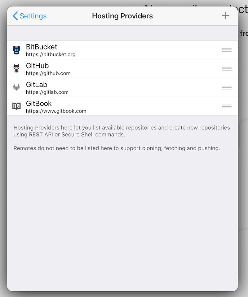 Después de buscar vi que la aplicación Working Copy era la mejor de todas. Tiene lo típico que se le puede pedir a un cliente de Git pero añade un par de funciones muy interesantes. La primera es que se integra de manera sencilla con los servicios de Git más comunes: GitHub, BitBucket, GitLab y GitBook. Aunque si tienes un servidor propio también puedes integrarlo sin problemas.