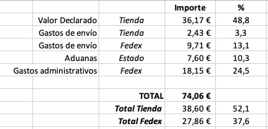 En resumen, los estabilizadores que cuestan 36€ han visto incrementado su precio entre unas cosas y otras hasta los 74€. De los cuales casi el 38% ha ido al bolsillo de Fedex. Aquí una pequeña tabla que hice con el resumen de como se reparten los gastos suponiendo que de los gastos de envío Zeal PC se queda un 20%.