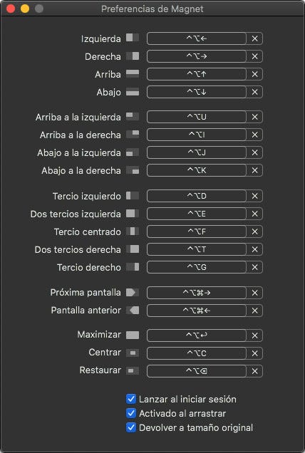 Una aplicación que lleva a macOS a la altura de Windows e incluso lo supera es Magnet. Con Magnet es posible redimensionar las ventanas arrastrándolas al border de la pantalla de muchas más formas de las que lo hace Windows. Windows 10 se queda en maximizar, utilizar la mitad de la pantalla en vertical o un cuarto. Magnet además puede usar mitades en horizontal, tercios en vertical, centrar una ventana y mover entre pantallas. Y si no quieres estar arrastrando las pantallas por la ventana puedes utilizar atajos de teclado completamente personalizables.