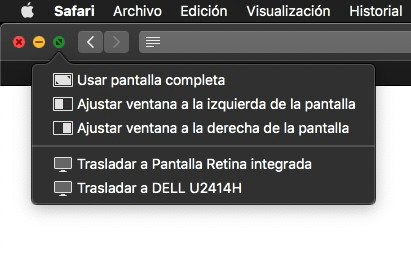 En macOS hace tiempo que se introdujo una opción bastante más recortada, dejando pulsado el botón de cambiar a pantalla completa de una ventana, el verde, aparecen opciones similares pero solo siendo posible trasladar la ventana de monitor y redimensionarla a una de las dos mitades de la pantalla.
