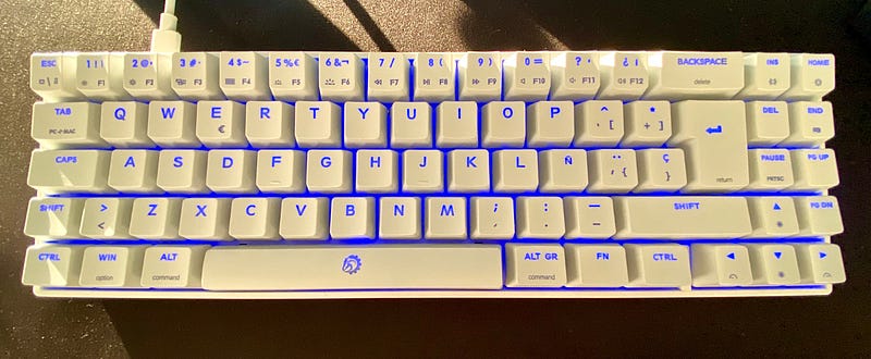 Lo que más dudas me planteaba que era su diseño 60% un tanto especial, fue lo de menos. Las teclas de las que prescinde el Calibur V2 en casa las uso muy poco, aunque siempre puedo utilizarlas empleando algún atajo que tiene integrado el teclado para derivar su función a otras teclas (por ejemplo la línea de números también es la de las F). Sí debo reseñar una excepción, utilizo mucho las teclas multimedia de subir y bajar volumen así como las de pausa y reproducción, en este teclado no hay manera de tenerlas en Windows a no ser que se use el software de Drevo y mapearlas en otras teclas, yo he mapeado el subir y bajar volumen en las teclas PG UP y PG DN respectivamente.