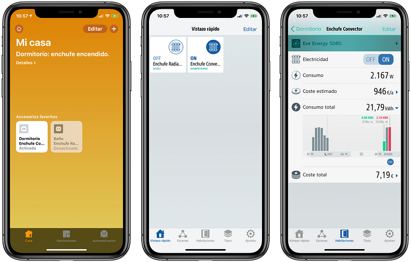 Hacer funcionar un Eve Energy es de lo más simple, una vez el enchufe ha quedado conectado tan solo tengo que escanear su código QR con la aplicación Casa de iOS o la de EVE. Hecho esto el enchufe queda enlazado, después hay que darle un nombre e indicar en que habitación se encuentra. Esto es necesario para que Siri sepa que hacer si le digo que encienda el radiador del baño por ejemplo.