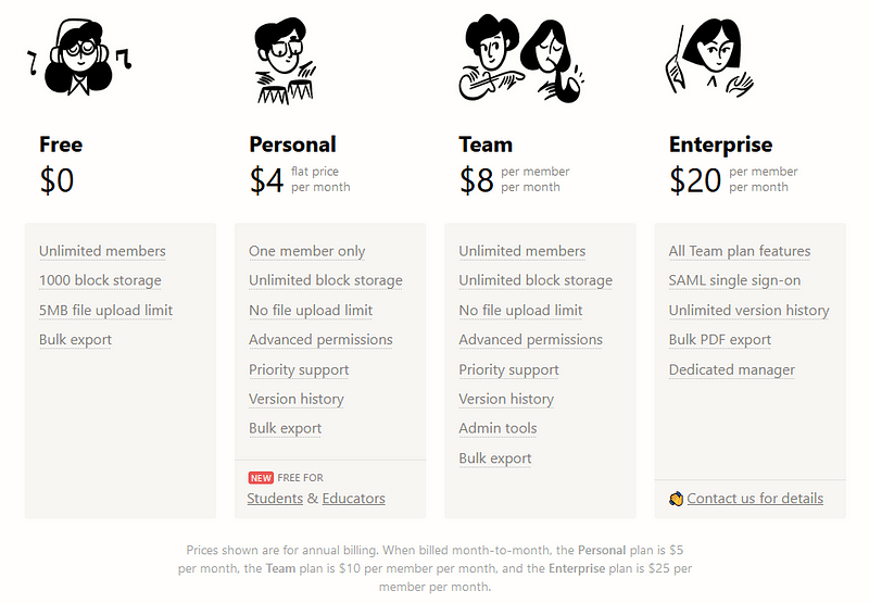 Respecto a los precios, tiene versión gratuita que es perfectamente funcional incluso para ser usada en equipos de trabajo, la única limitación que puede ser un handicap son los 5MB de tamaño máximo por fichero, aunque como se integra con Google Drive, el problema se resuelve fácil. El resto de planes añaden funcionalidad extra que pueden resultar útiles para equipos. Exite un plan personal que cuesta 4$ al mes pero que tiene una promoción para estudiantes y profesores que lo deja gratis al registrarse con el mail de la universidad o escuela.