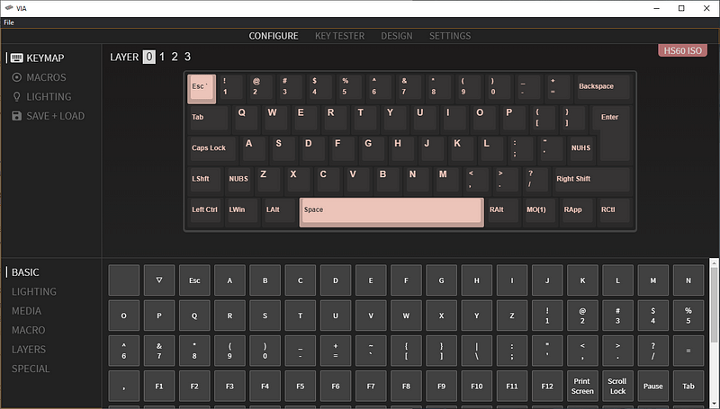 Ahora que he dado el salto a los teclados custom un nuevo mundo de configuración se abre ante mí. La placa base que utiliza mi teclado, la HS60 de Mechboards, permite configuración a través de QMK configurator y VIA. Dos formas de configurar absolutamente todo lo del teclado, no solo iluminación y macros, si no lo que hace cada tecla y la posibilidad de crear distintos mapas de teclas.