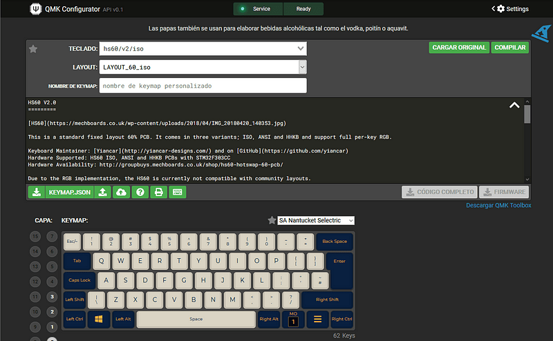 Y esto es QMK Configurator, aunque a nosotros se nos presenta a través de una web. En esta web previa selección de la PCB que se quiere flashear pueden configurarse todas las teclas y crear los distintos mapas. Después tan solo hay que compilar y descargar el firmware. Y por último flashearlo a través de QMK Toolbox poniendo antes el teclado en modo DFU.