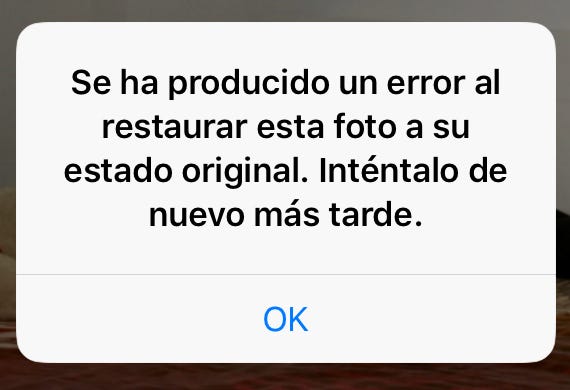 El primero es el más importante porque pone en riesgo los archivos RAW. Si editamos la fotografía en Fotos el RAW desaparece y la imagen se convierte a JPG. El problema es mayúsculo porque deshacer los cambios y volver a la imagen original da el error que veis sobre estas líneas después de algunos segundos procesando la orden. Repito, mucho cuidado, una imagen RAW editada en la aplicación Fotos se pierde!